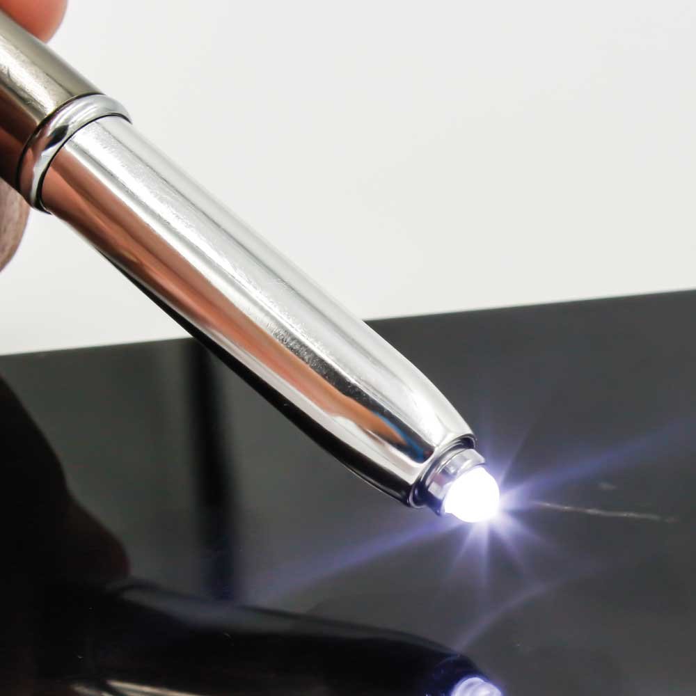 Premium 3-in-1 metal pen featuring a crystal stylus and built-in LED light.
