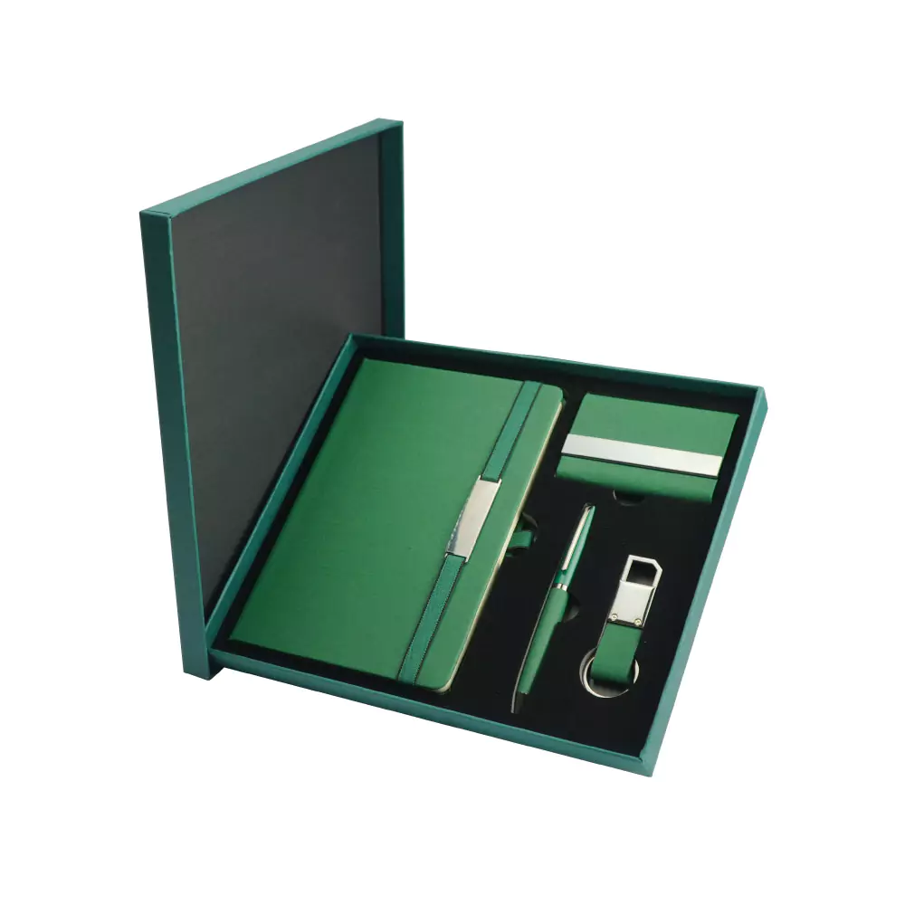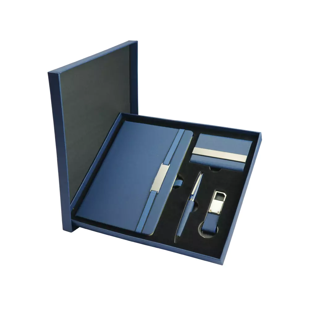 Premium office gift set featuring a PU leather notebook, metal pen, card holder, and keychain in a stylish box—perfect for corporate gifting and promotions.